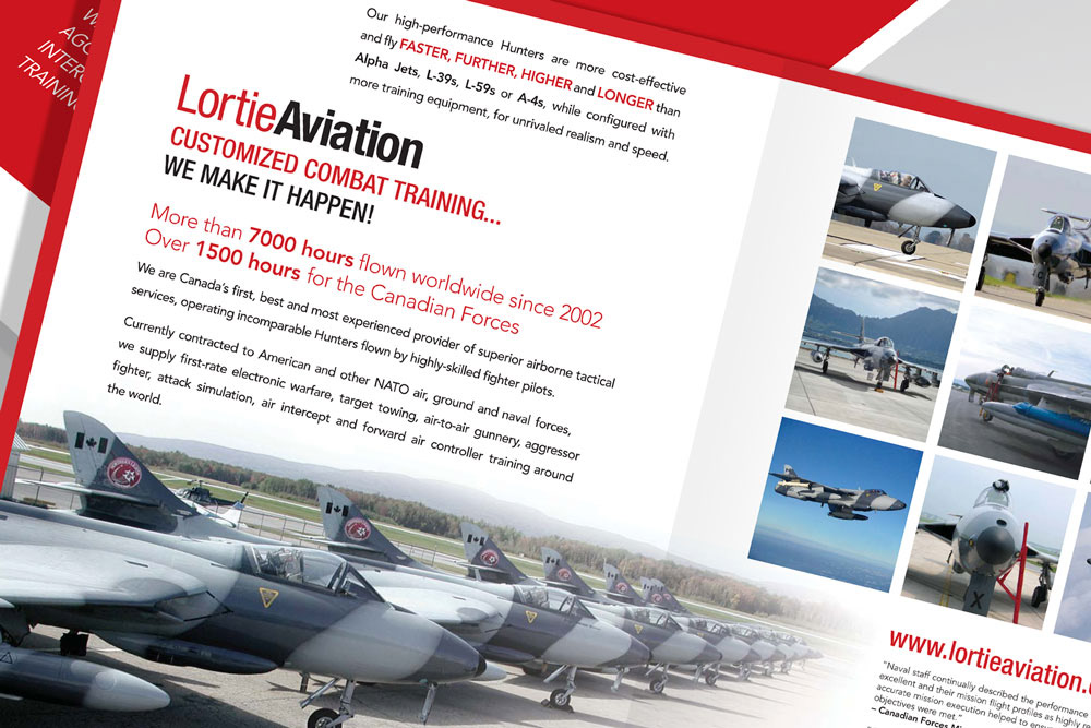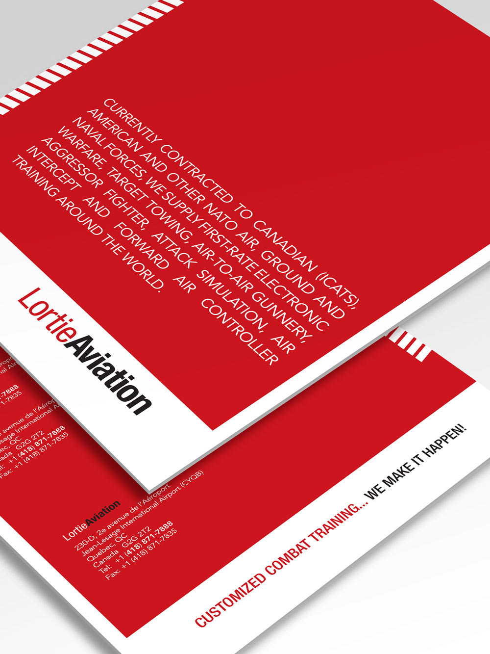 This fierce, bold company needed some printed collateral that would represent them at trade shows and one-on-one meetings with prospective clients. The sharp red design embodies the company's 100% Canadian ownership and the white strips gives a strong, energetic feel to the piece, a graphic callback to runway lines.