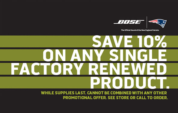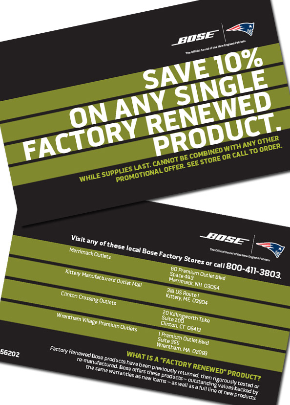 This voucher was created as a handout for Patriots Place which provided ticket-holders an additional 10% savings on product purchases. The design ties into the Bose private tent located at Patriots Place.