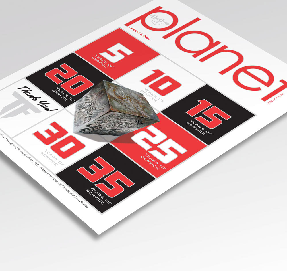 Planet newsletter cover announcing annual years of service awards featuring Transformers artwork details.