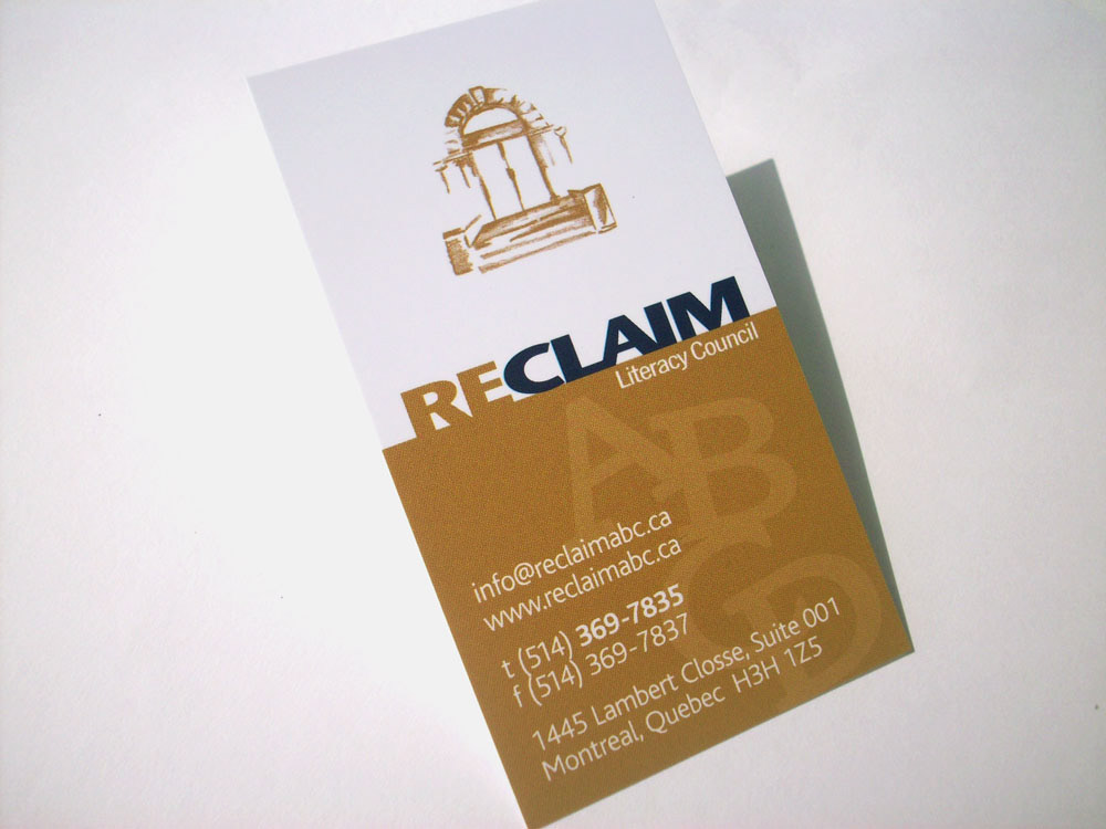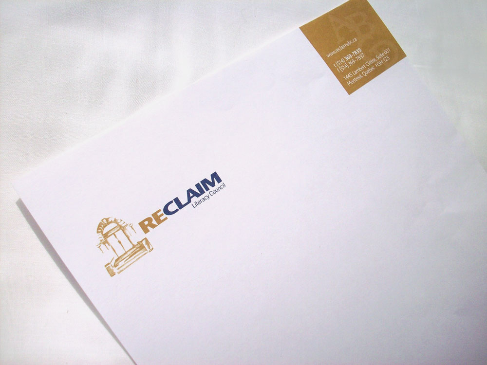 Reclaim is a not-for-profit literacy program for adults. The illustration of the front entrance of the literary council represented the universal recognition of a pictogram as a communicating visual. It also serve to communicate the idea of opening doors and striving to step up to a challenge. The colors were chosen from a classic palette often seen in higher education.