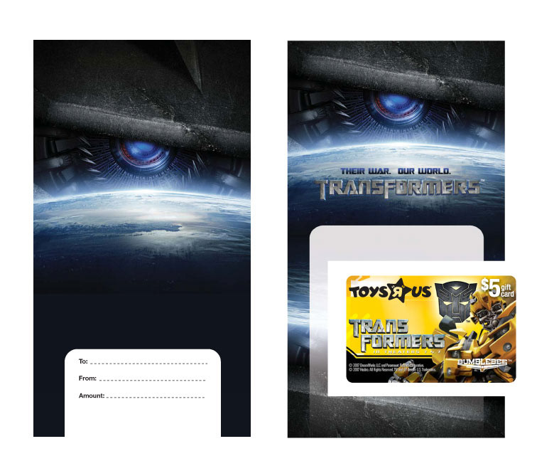 Transformer gift cards developed exclusively for "Toys 'R' Us" and "KB Toys" for Hasbro Trade Marketing.